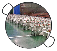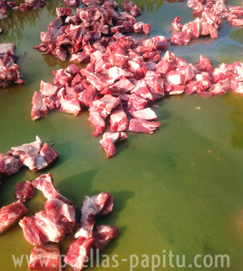 El proceso para realizar este evento empieza el mismo día, llegamos con nuestros vehículos donde transportamos todo lo necesario para su preparación; descargamos esta magnifica paella de acero inoxidable y la situamos sobre barbacoas para no tocar el suelo con el fuego, un fuego de leña que da gran sabor.